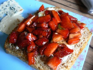 Będąc ostatnie 2 tygodnie we Francji, nie mogłam się napatrzeć na pojawiające się przepisy pełne truskawkowych wariacji. Nic dziwnego więc, że zaraz po powrocie, pierwszym z zakupów były właśnie truskawki. Lubię ich wytrawne wersje (jak na przykład tutaj), więc zaraz po objedzeniu się „czystymi” truskawkami, padło na ich połączenie z błękitnym serem pleśniowym (w ramach patriotyzmu lokalnego wybieram Lazur). Myślę, że to będzie mój domowy hit truskawkowego sezonu.