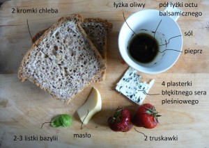 Każdą z kromek posmarować cienką warstwą masła. Truskawki umyć, oderwać szypułki i pokroić w drobną kostkę. Oliwę wymieszać z octem balsamicznym, odrobiną soli i pieprzu i porwanymi liśćmi bazylii. Połączyć z truskawkami i dokładnie wymieszać. Na kromkę chleba (na nieposmarowanej masłem stronie) ułożyć 2 plasterki błękitnego sera, wyłożyć na to truskawki i ponownie położyć 2 plasterki sera. Przykryć drugą kromką chleba, nieposmarowaną stroną do wewnątrz. Rozgrzać patelnię grillową i grillować grzankę ok. 2-3 minut na każdej ze stron (podczas grillowania chleb można delikatnie do siebie dociskać). Smacznego!