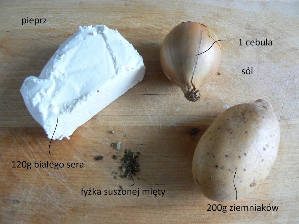 Ziemniaki obrać i ugotować. Cebulę pokroić w drobną kostkę i zeszklić na patelni na odrobinie masła. Wystudzone ziemniaki rozdrobnić widelcem, dodać ser biały, cebulę oraz sól, pieprz i suszoną miętę (przy 1 łyżce mięty jej smak jest bardzo intensywny). Wszystko dokładnie wymieszać, aż do zupełnego połączenia składników.