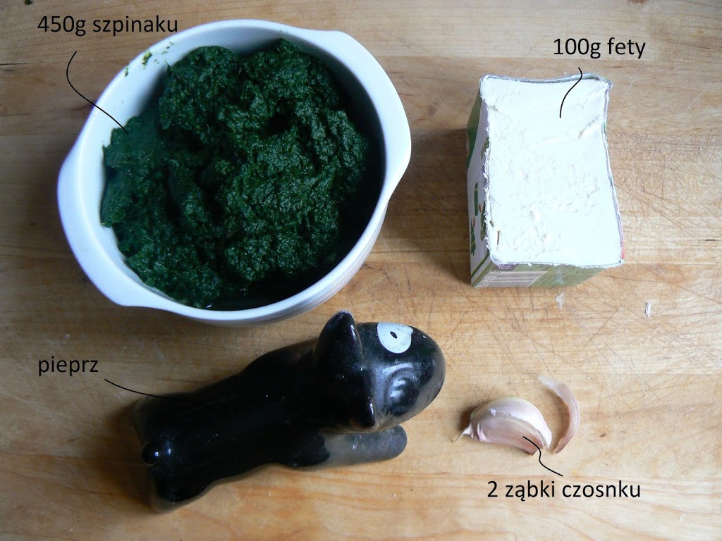 Szpinak podsmażyć na patelni. Dodać rozdrobnioną fetę, 2 zgniecione ząbki czosnku i pieprz. Dokładnie wymieszać, aż do zupełnego połączenia składników.