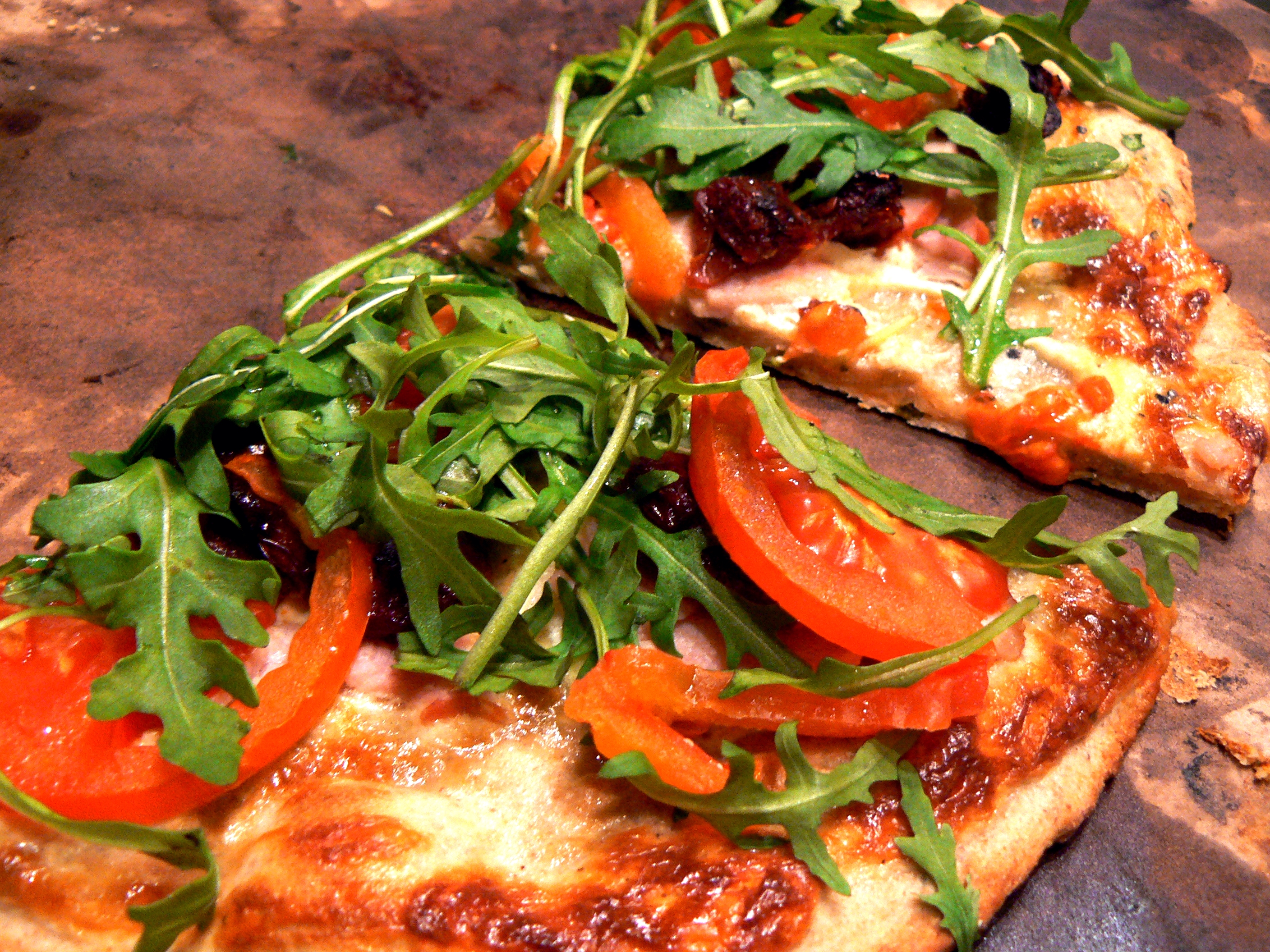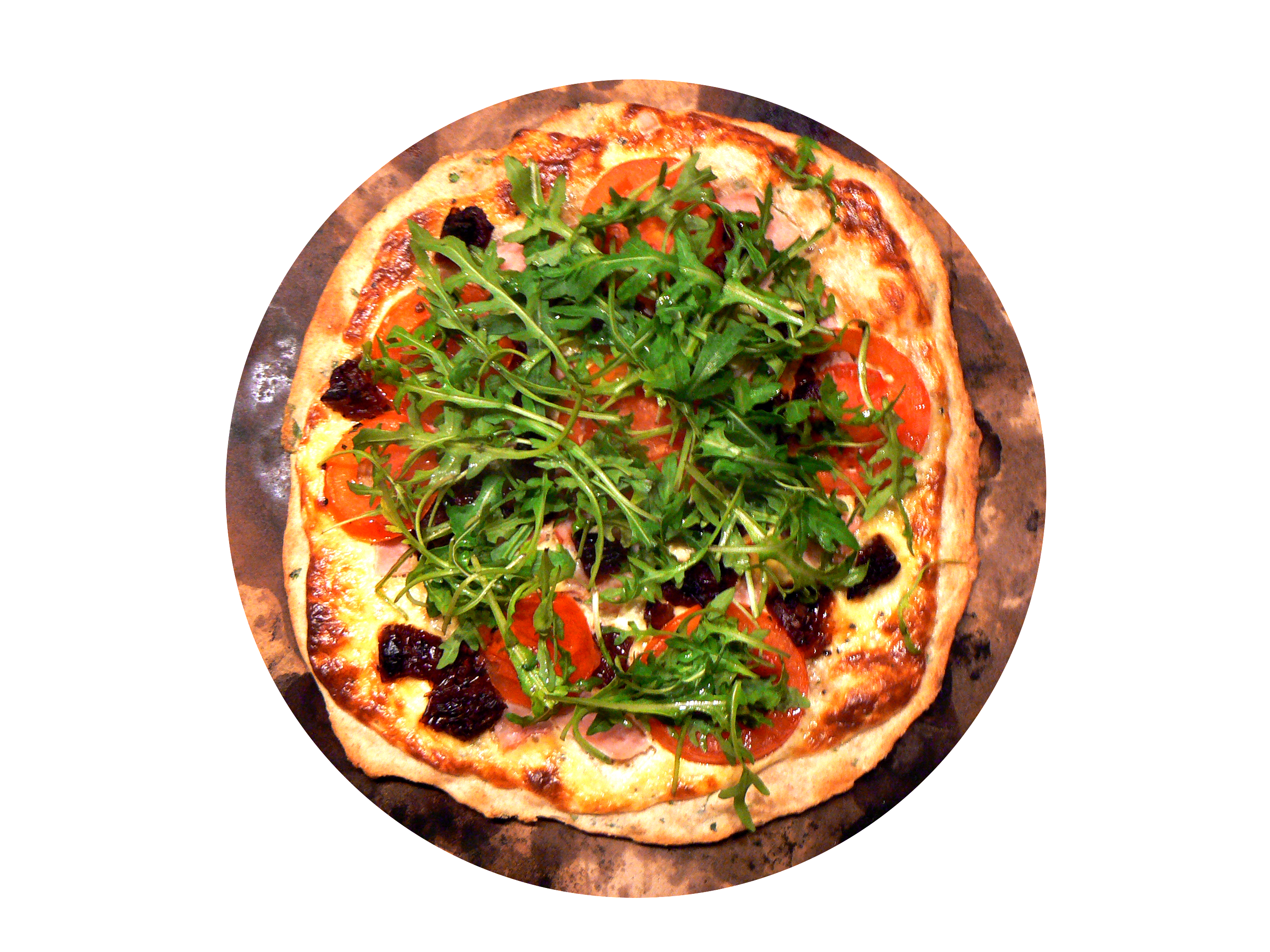 Piekarnik rozgrzać do maksymalnej temperatury (u mnie 280C), zostawiając w środku kamień do pizzy (lub blachę). Przesiać mąkę do miski, dodać szczyptę soli, posiekaną kolendrę i pietruszkę (można zrobić ciasto bez dodatku ziół lub dodać inne) i stopniowo dolewając oliwę i wodę wyrabiać ciasto. Wyrobione ciasto powinno być gładkie i elastyczne. Jeśli będzie się kleiło, dodać więcej mąki, jeśli będzie zbyt sypkie, dodać więcej wody. Gotowe ciasto przykryć ściereczką i odłożyć na 30 minut, żeby odpoczęło. W tym czasie przygotować sos. W miseczce wymieszać śmietanę, ze startym żółtym serem, jajkiem, doprawić pieprzem i ewentualnie czarnuszką. Pokroić pomidory, suszone pomidory i szynkę (lub jakiekolwiek składniki używacie). Ciasto podzielić na dwie części. Rozwałkować pierwszą połówkę na cienki placek. Z piekarnika wyjąć kamień do pizzy/blachę, przełożyć na niego placek, posmarować połową sosu, ułożyć na wierzch pokrojone składniki. Piec ok. 8 minut (czas może się zmienić w zależności od temperatury piekarnika i grubości ciasta), aż do uzyskania złotych i chrupiących brzegów. Wyjąć placek z piekarnika, pokroić i ułożyć na nim rukolę. To samo powtórzyć z drugą połówką ciasta (można też ją schować do lodówki i wykorzystać później).