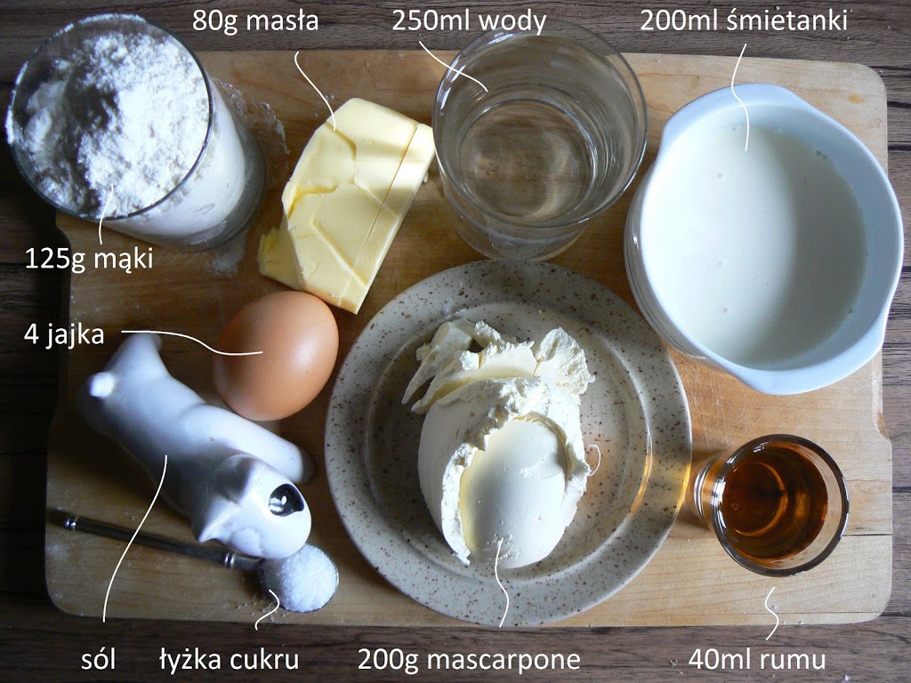W garnku zagotować wodę z masłem. Dodać szczyptę soli i łyżkę cukru. Kiedy masło się rozpuści dodać mąkę i mieszać do uzyskania gładkiej masy. Zdjąć garnek z ognia. Do ostudzonego ciasta dodawać po 1 jajku stale mieszając. Przełożyć masę do rękawa cukierniczego i na blachę wyłożoną papierem do pieczenia wyciskać kulki (należy zachować odstępy, ponieważ ciasto znacznie urośnie). Piec ok. 20-25 minut w 200C. Ubić śmietankę z serkiem mascarpone. Do masy dodać rum i ponownie ubić. Napełnić kremem szprycę cukierniczą i nadziać nim wystudzone profitrolki.