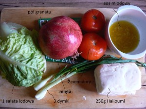 Ser Halloumi pokroić w plastry i zgrillować, aby stał się chrupiący. Liście sałaty porwać na kawałki. Pomidory i dymkę pokroić. Granat przekroić na pół i uderzać w niego drewnianą łyżką, aby wypadły w niego pestki. Wszystkie składniki wymieszać w misce, dodać do nich miętę. Składniki sosu połączyć razem, polać nim sałatkę i dokładnie wymieszać.