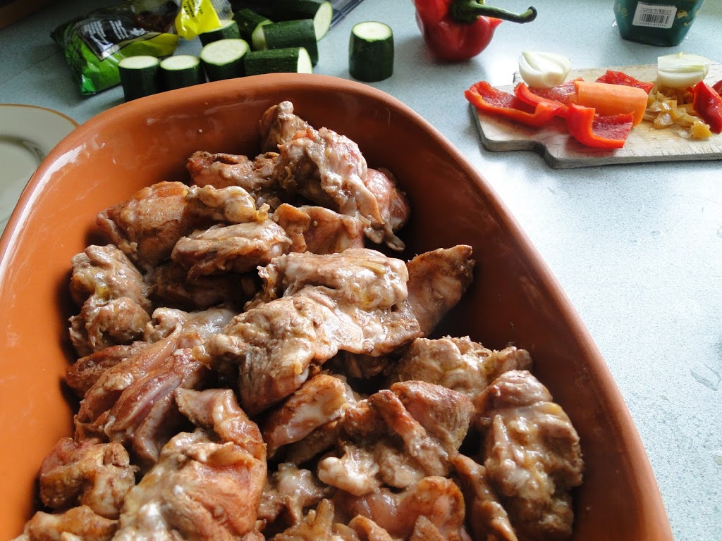 1 kg zamarynowanego kurczaka (ja użyłam udka kurczaka, już bez kości i skóry)