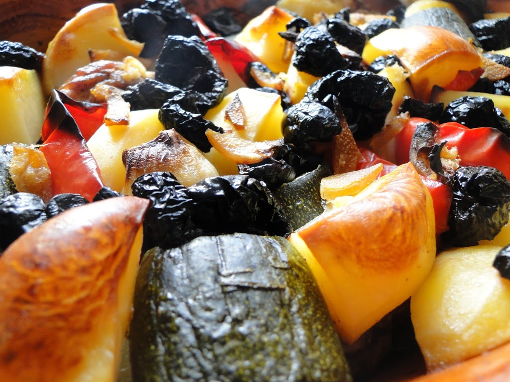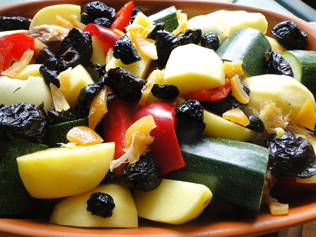 Kurczaka skropić sokiem z marynowanej cytryny i wymieszać z pozostałymi składnikami marynaty. Odstawić do lodówki na kilka godzin. Marchewki obrać, pokroić na 2-3 części i wydrążyć środki (marchewki lepiej wchłaniają wtedy smak i aromat potrawy). Ziemniaki i cebulę obrać i pokroić w ćwiartki. Cukinię i paprykę pokroić na większe kawałki. W garnku tagine, garnku rzymskim lub naczyniu do zapiekania ułożyć na dnie marchewki, wydrążeniem do dołu. Kurczaka przesmażyć ok. 5 minut na patelni i położyć na marchewkę. Dodać ziemniaki, cukinię, cebulę i paprykę. Wszystko posypać oliwkami, rodzynkami i śliwkami oraz drobno pokrojoną skórką z marynowanej cytryny. Podlać odrobiną wody. Przykryć garnek lub naczynie i włożyć do piekarnika nagrzanego do 180C na ok. 1,5 godziny (jeśli używacie tajin, gotujcie danie ok. 3 godzin na wolnym ogniu).