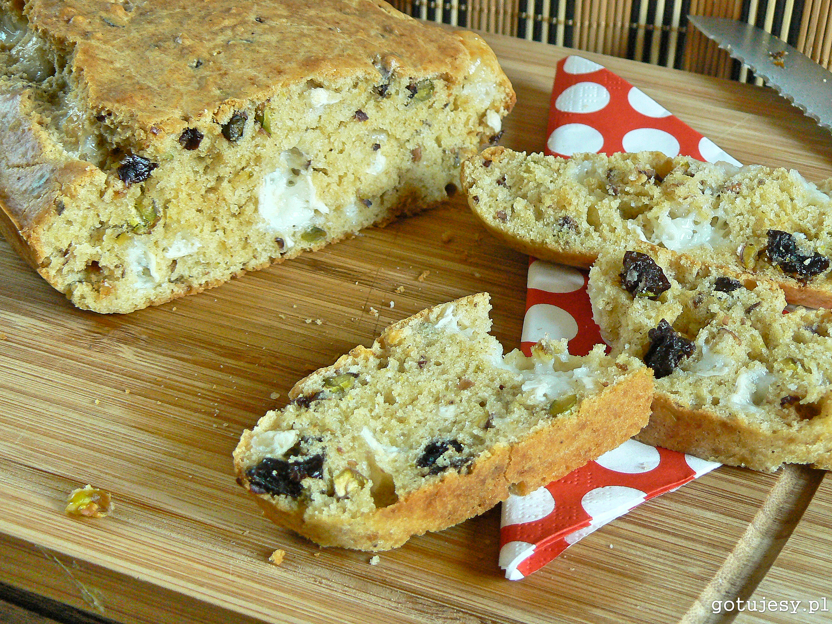 Mąkę wymieszać z proszkiem do pieczenia. Kozi ser, suszone śliwki i pistacje posiekać na mniejsze kawałki. Dodać do mąki i wymieszać. Jajka ubić na jasną i puszystą masę (ok. 10 minut). Dodać oliwę, mleko i jogurt. Doprawić pieprzem. Wymieszać. Suche składniki dodać do mokrych. Delikatnie wymieszać. Formę do pieczenia (np. taką do chleba) wyłożyć papierem. Wylać do niej masę. Piec 35-40 minut w piekarniku nagrzanym do 180C. Smacznego!